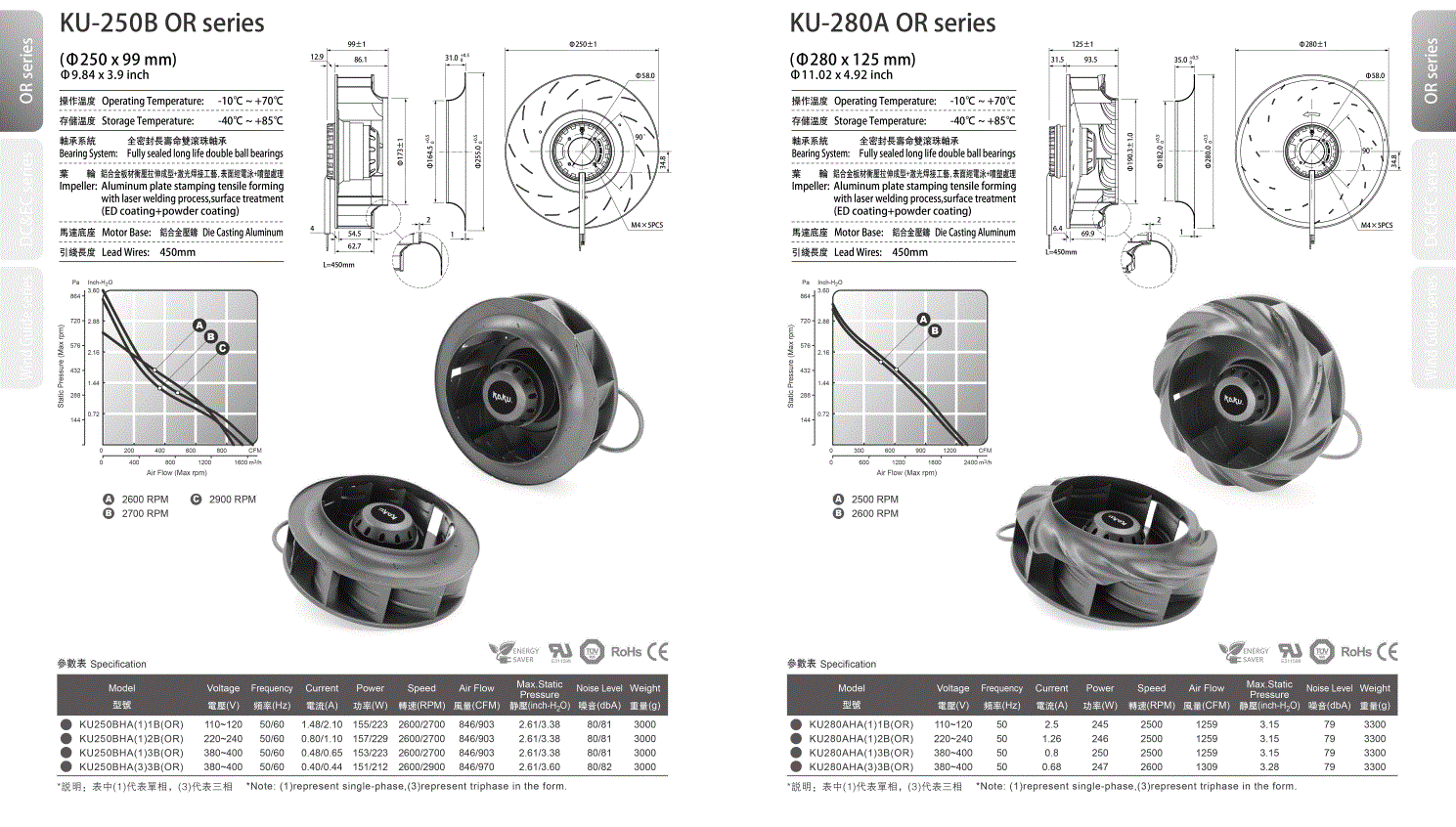 원심형_KU250B_280A OR 사이즈 Ø250*99 OR Ø280*125 DOWNLOAD Catalogue원심형_카다로그_KU250B_280A_OR_최신.pdf 목록으로 Specification